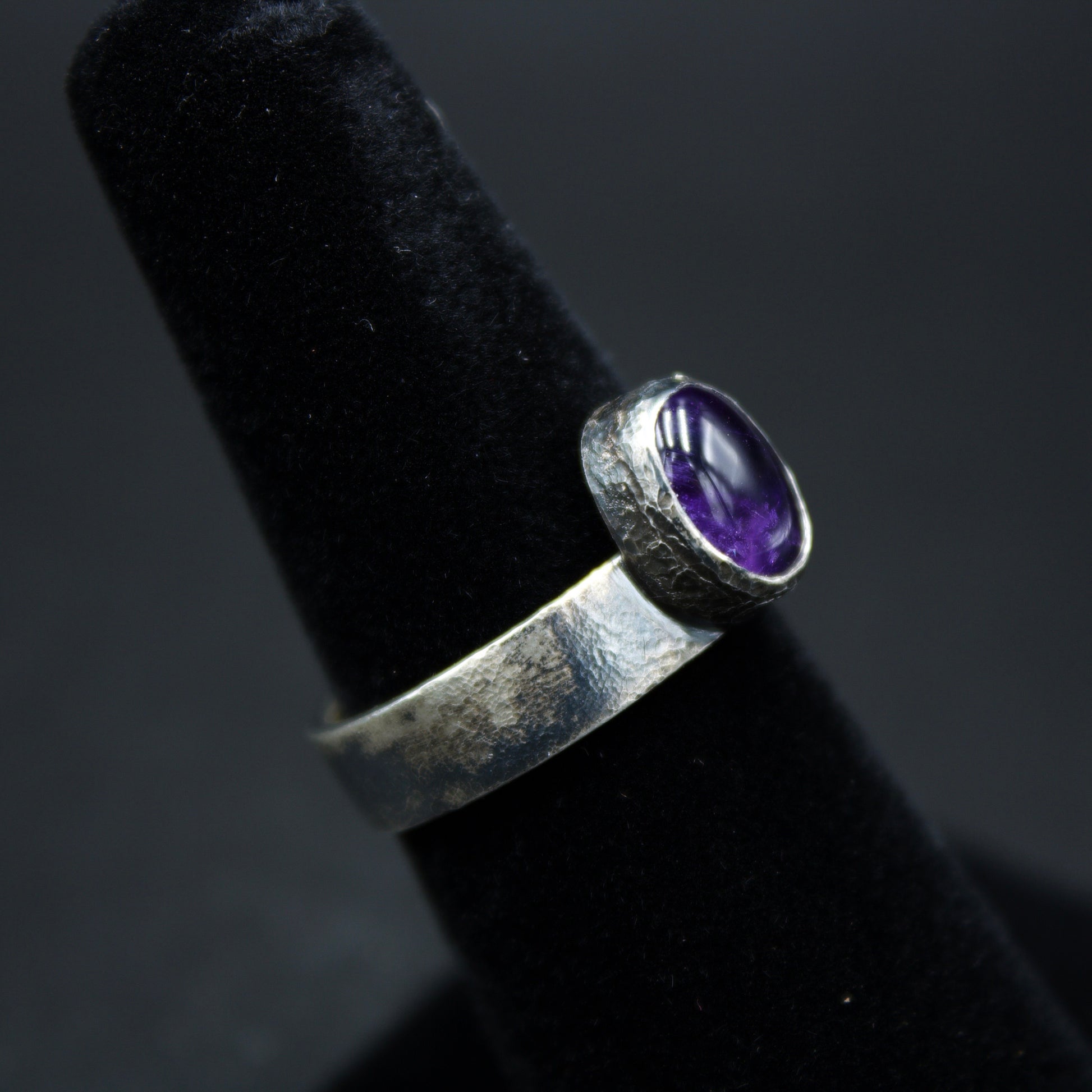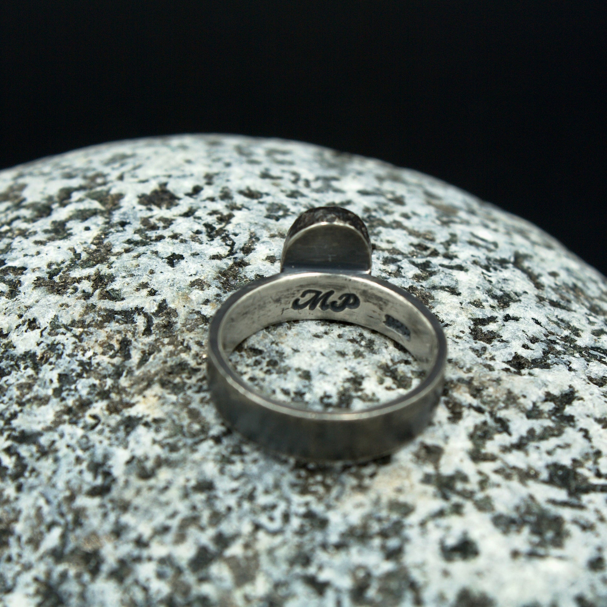 The sterling silver band is textured and darkened with a patina finish, giving it the worn elegance of a long-buried relic — something unearthed from time, not trend. It is stamped with the artist's signature (MP) and 925.