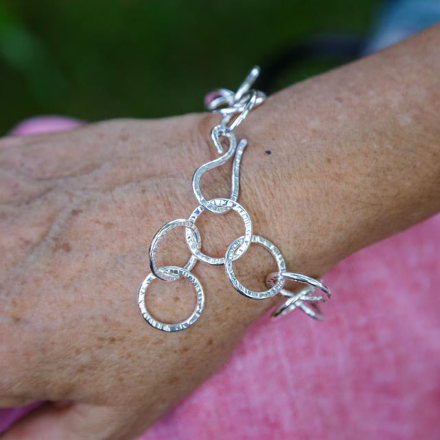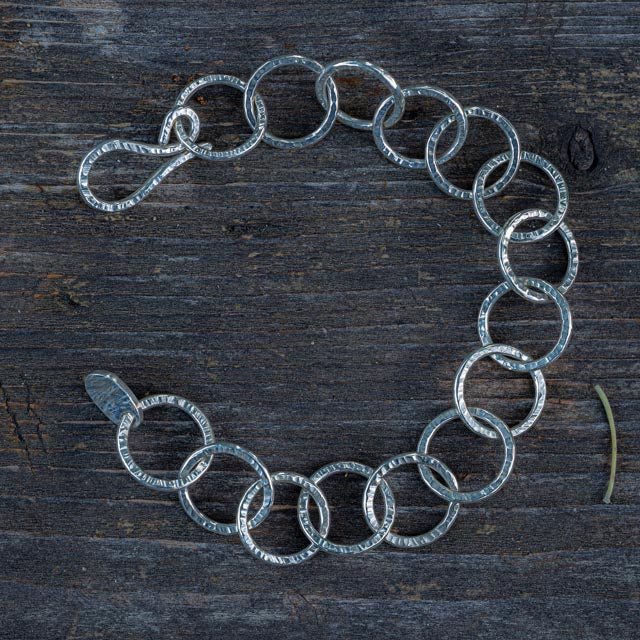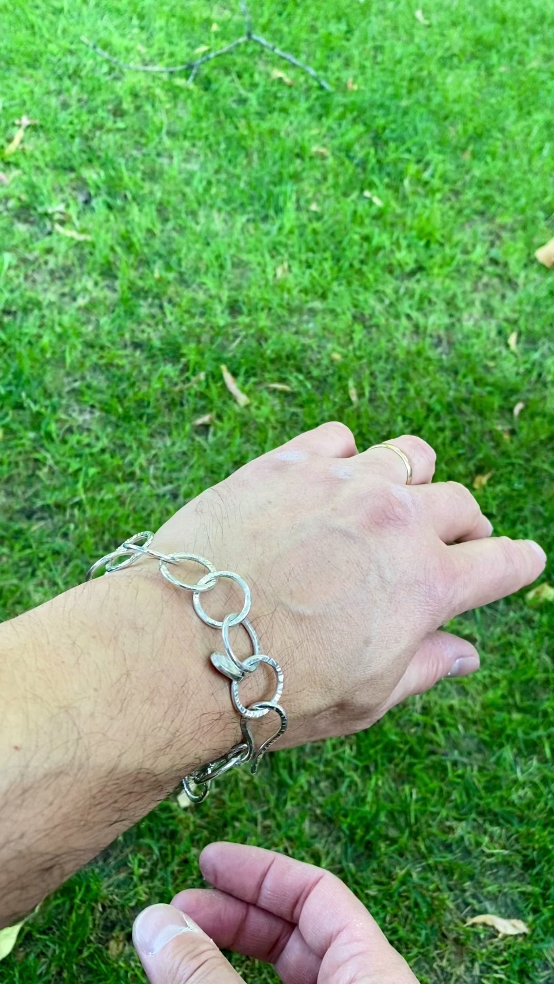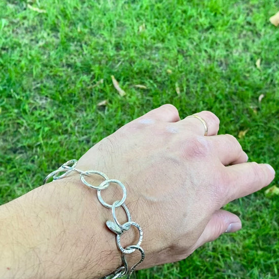 Bold, textured, and unmistakably alive — Cascabel (Spanish for jingle bell) is a statement bracelet that delights both the eye and the ear. Made from chunky sterling silver with a richly hammered surface, every link catches the light and hums with movement. This is not a quiet piece — it jingles gently with every motion, announcing your arrival before you speak.